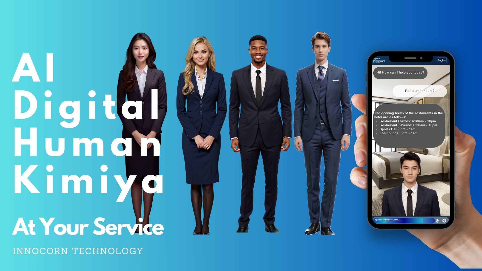 AI Kimiya is an in-room hotel assistant that enhances guest experiences with natural voice interactions and multilingual communication. UNITED STATES, August 19, 2024 /EINPresswire.com/ -- Innocorn, a leader in AI technology, is proud to announce the launch of AI Kimiya, an innovative AI in-room assistant designed to enhance guest experiences in the hospitality industry. AI Kimiya is set to redefine how guests interact with hotel services, offering a seamless and intuitive way to access amenities, order room service, and receive personalized assistance.